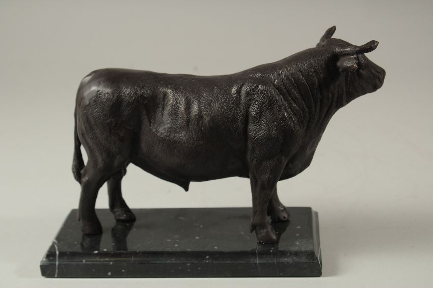 A BRONZE BULL on a marble base.