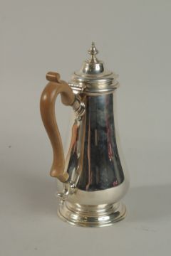 A GEORGIAN STYLE SILVER COFFEE POT with wooden handles.