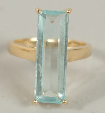 AN 18CT GOLD SINGLE STONE AQUAMARINE RING.
