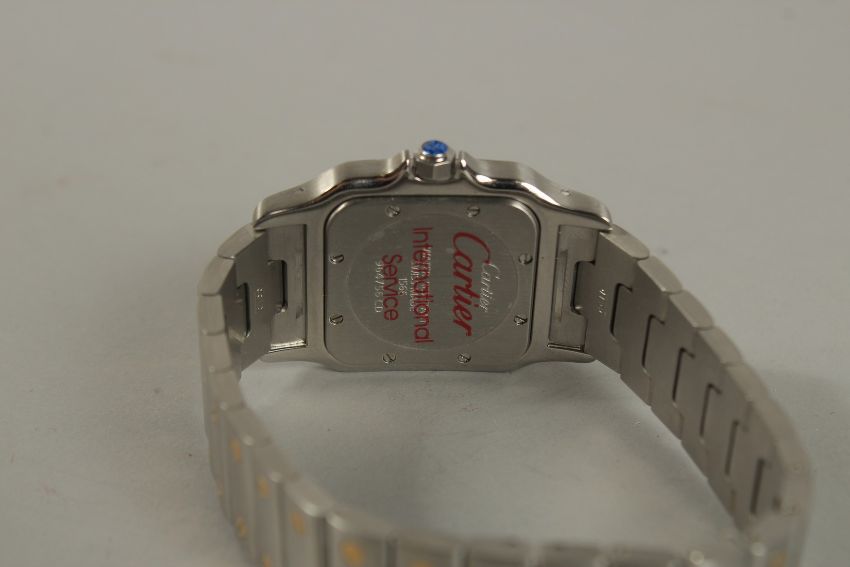 A CARTIER SANTOS TWO COLOURED STAINLESS STEEL WRIST WATCH.