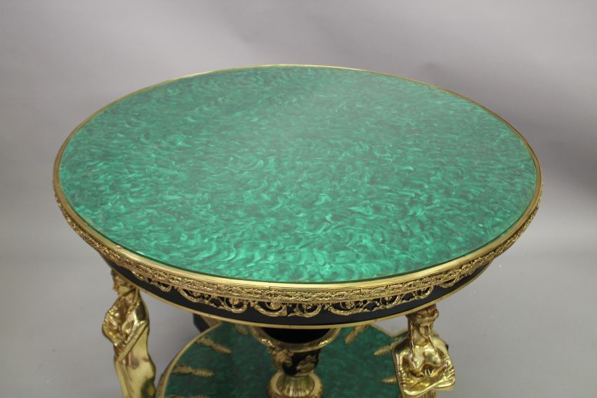 A SUPERB MALACITE AND ORMOLU, TWO TIER CENTRE TABLE supported by four ormolu figures.