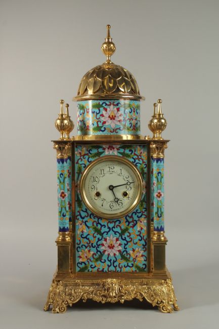 A LARGE LOUIS XVITH STYLE BRASS ENAMEL CLOCK with domed top, column sides and ornate brass base.