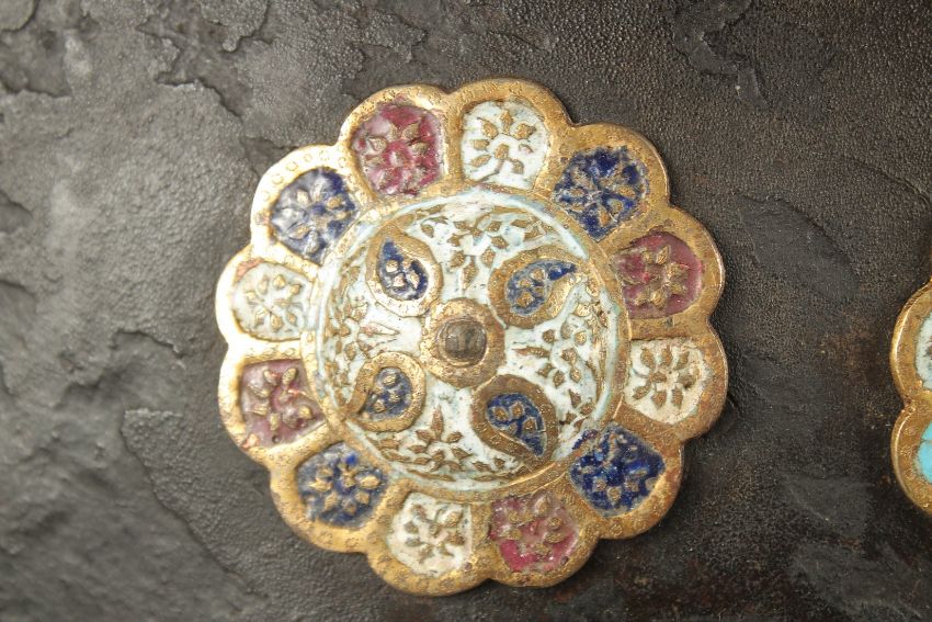 A 19TH CENTURY NORTH INDIAN LACQUERED HIDE SHIELD, with enamelled gilt metal bosses, 42cm wide.