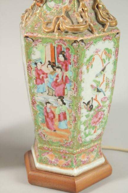 A FINE PAIR OF CHINESE CANTON FAMILLE ROSE PORCELAIN VASE LAMPS, painted with panels of figures, flora and fauna, with gilded chilong and foo dog handles, each mounted to fitted bases, vases 34cm high.