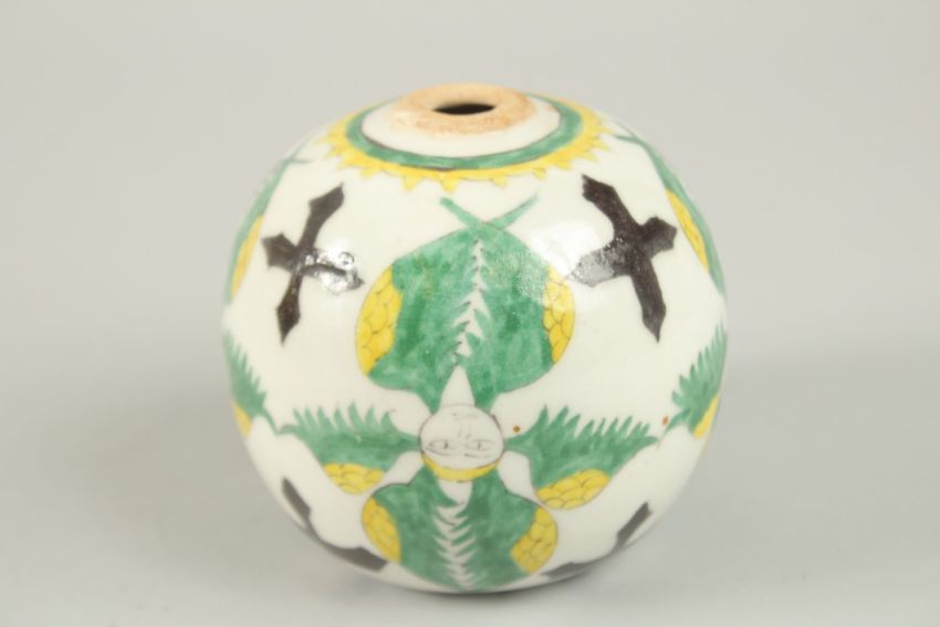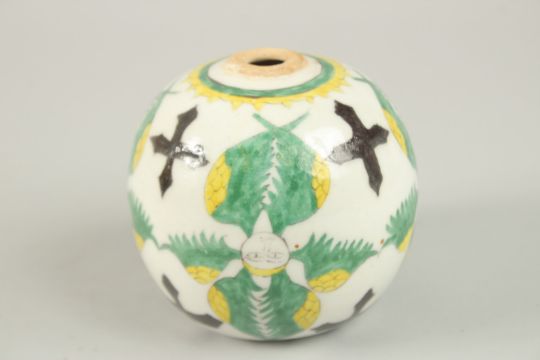 AN OTTOMAN TURKISH ARMENIAN POTTERY HANGING BALL, 10cm high.