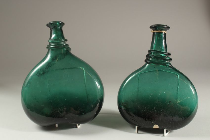 A PAIR OF 17TH CENTURY PERSIAN SAFAVID GREEN GLASS SADDLE FLASKS, largest 22cm high.