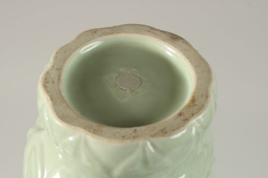 A CHINESE CELADON GLAZE PORCELAIN VASE, with carved dragon and ruyi decoration, the base with character mark, 34.5cm high.