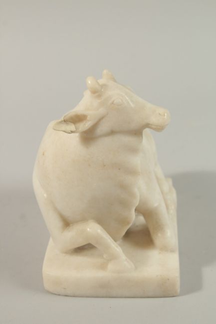 A FINE 18TH CENTURY MUGHAL INDIAN WHITE MARBLE NANDI BULL, base 17cm x 10cm.