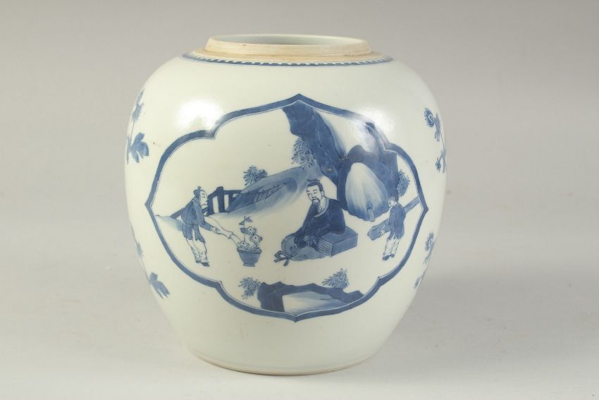 A CHINESE BLUE AND WHITE PORCELAIN JAR -possibly Kangxi period, decorated with two panels depicting various figures in outdoor settings, 20cm high.
