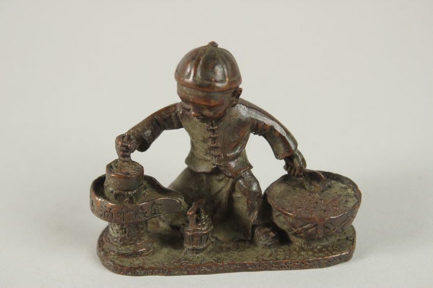 A BRONZE OKIMONO OF A BOY GRINDING COFFEE.