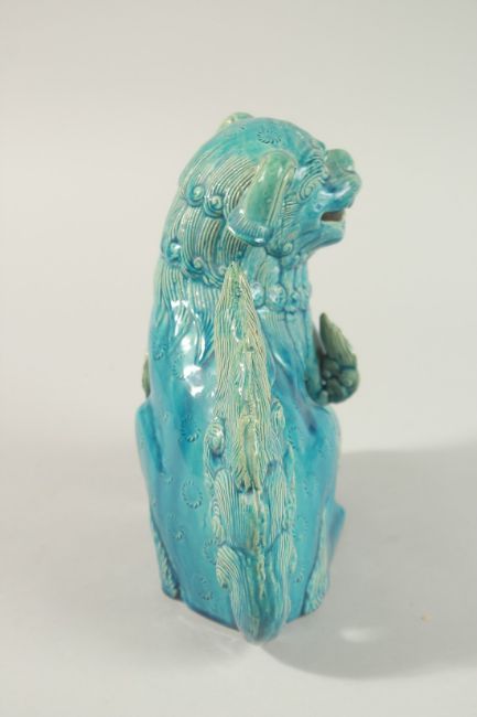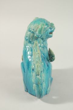 A CHINESE TURQUOISE GLAZE PORCELAIN LION DOG, 20.5cm high.