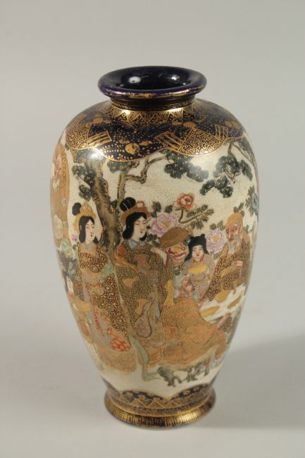A JAPANESE COBALT BLUE SATSUMA VASE, depicting a scene with multiple figures including an immortal riding a dragon, their robes with finely detailed gilt highlights, the base with character mark, 22cm high.
