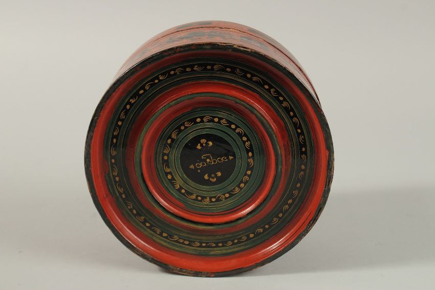 A 19TH CENTURY THAI OR BURMESE LACQUERED PAPIER MACHE CIRCULAR BOX, with interior tray and signed to base, 18.5cm diameter.