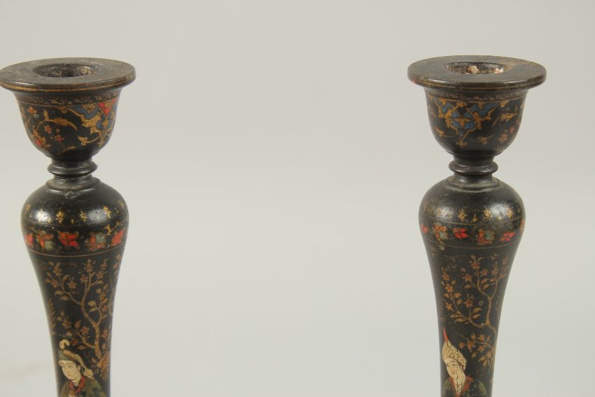 A PAIR OF PERSIAN QAJAR LACQUERED WOOD CANDLESTICKS, decorated with figures and flora, 26.5cm high.