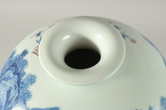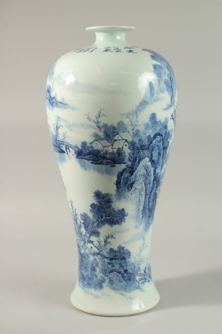 A VERY LARGE CHINESE BLUE AND WHITE PORCELAIN VASE, decorated with an expansive mountainous landscape scene with waterfall and nestled buildings, inscribed to the shoulder, 52cm high.