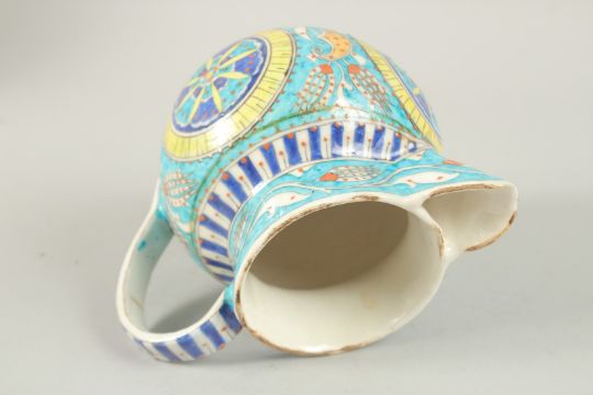 AN OTTOMAN TURKISH KUTAHYA GLAZED POTTERY JUG, 14.5cm high.