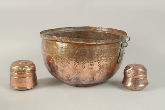 AN OMANI ENGRAVED COPPER BOWL, together with two copper boxes, (3).