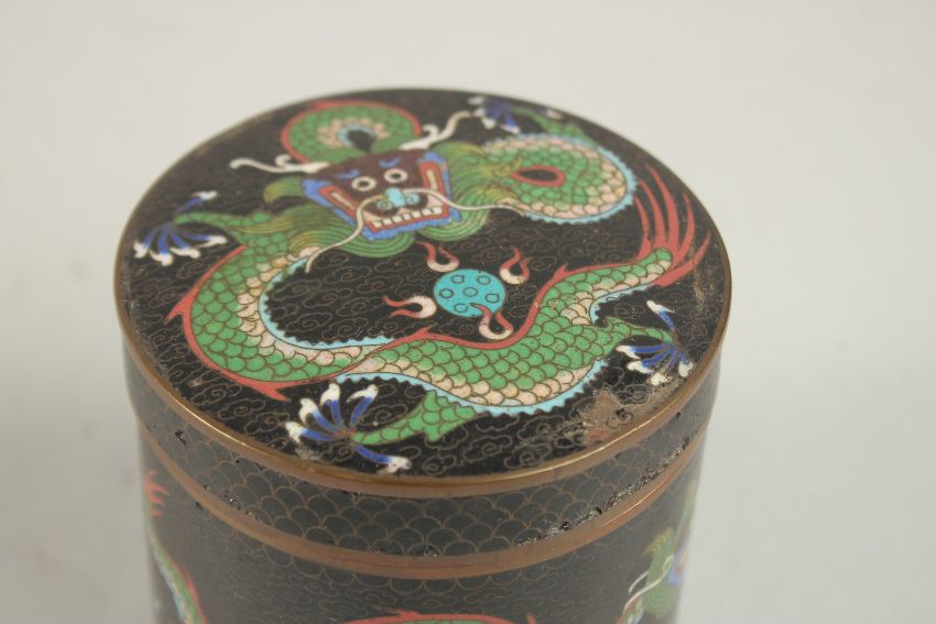 FOUR CHINESE CLOISONNE ITEMS: floral vase, and thre cylindrical lidded pots, (4).