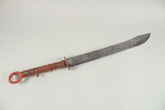 A FINE 19TH CENTURY CHINESE SWORD, with a wide engraved blade and fabric wrapped handle, 84cm long.