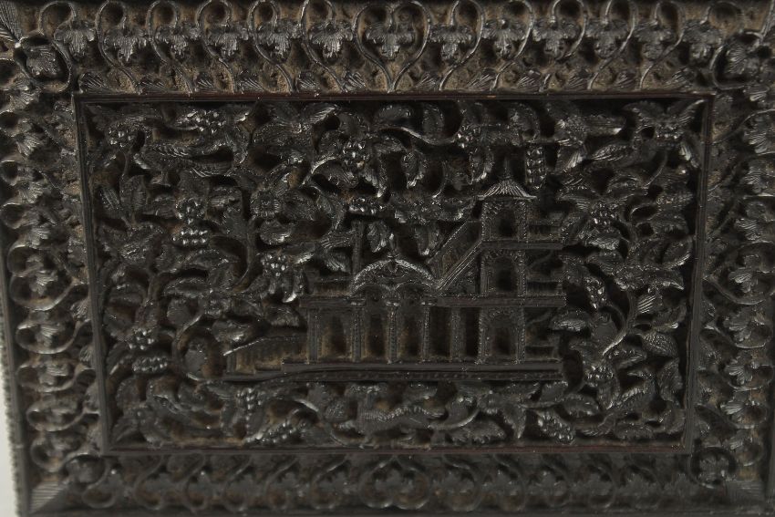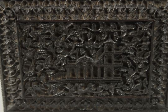 A FINE 19TH CENTURY ANGLO INDIAN MYSORE DEEPLY CARVED EBONY BOX, with finely carved animals and architectural designs, 20cm x 15cm x 6.5cm.