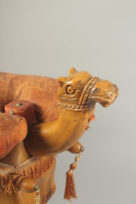 A EARLY-MID 20TH CENTURY EGYPTIAN CARVED WOOD CAMEL STOOL, with original embossed leather cushion, 47cm high, 55cm long.