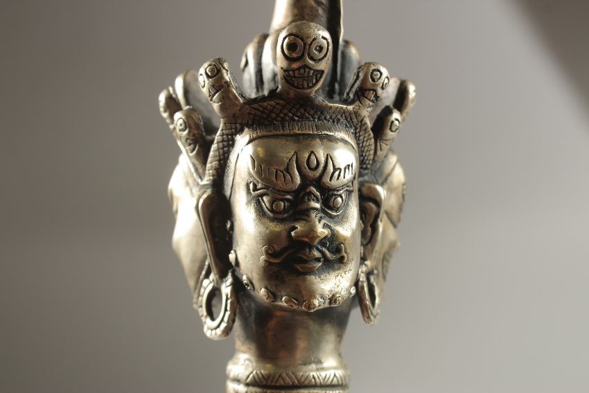 A TIBETAN BUDDHIST PHURBA / KILA RITUALISTIC DAGGER, the metal dagger decorated with various heads and creatures, 37cm long.
