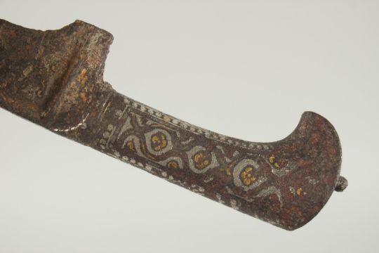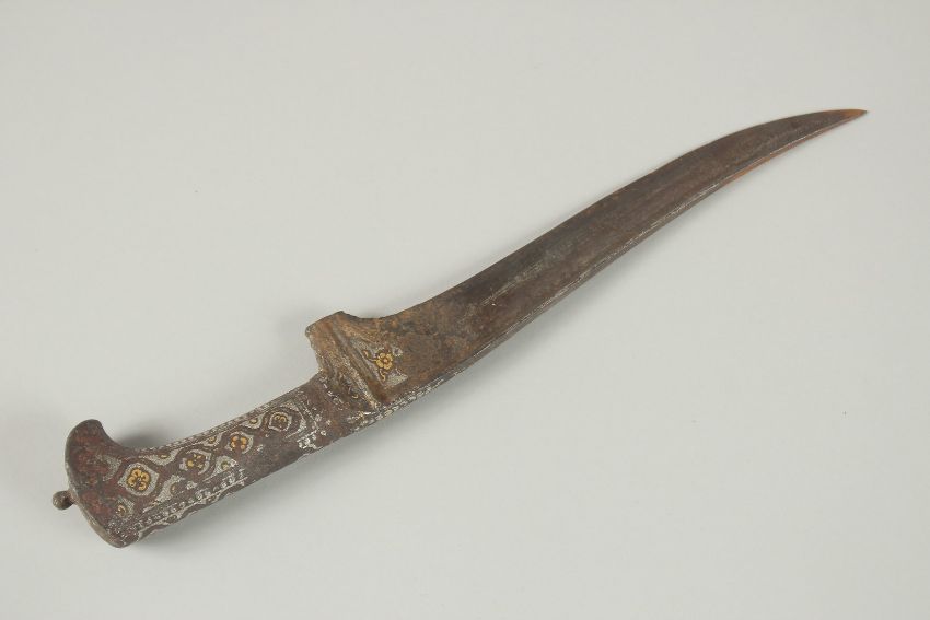 AN 18TH CENTURY MUGHAL INDIAN SILVER AND GOLD OVERLAID STEEL DAGGER, 33cm long.