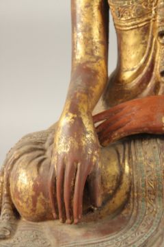 A VERY LARGE BURMESE GILT LACQUERED CARVED WOOD SEATED BUDDHA, with coloured glass inlays to the robe, (possibly with later carved wood hand), 62cm high, base 51cm wide.