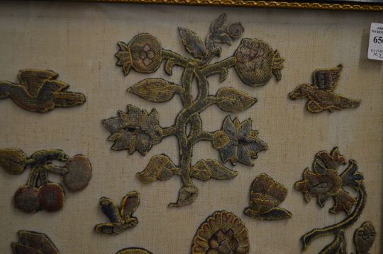 A collection of Stumpwork samples, framed and glazed and a similar small example.
