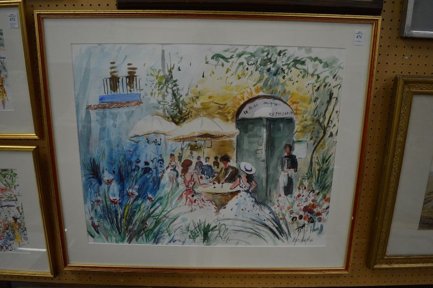Figures seated outside a restaurant, watercolour, indistinctly signed.