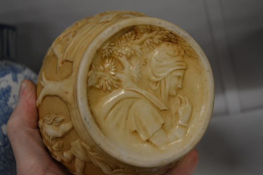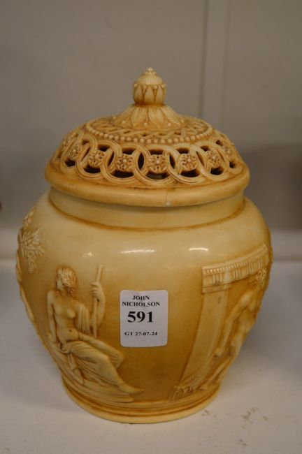 A potpourri jar with cover and liner, the body decorated with classical figures.