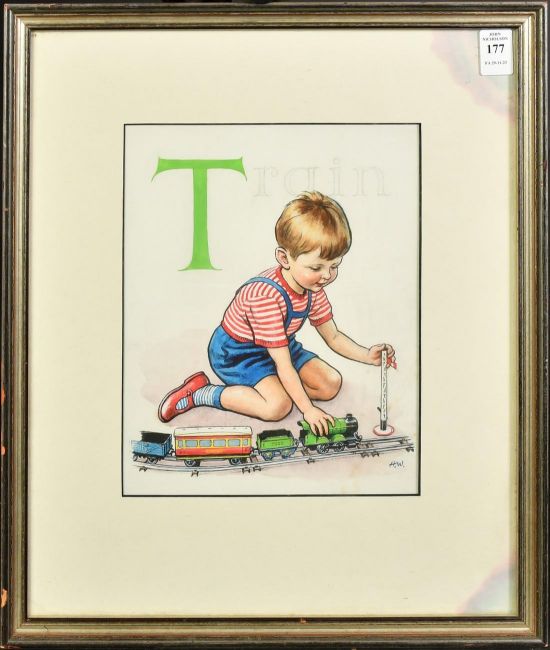 Hubert Williams (1905-1989), T for Train, scene of a young boy playing with a train set, watercolour, 10" x 8" (25.5 x 20cm).