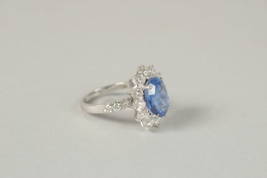 AN 18CT WHITE GOLD OVAL SAPPHIRE AND RBC DIAMOND CLUSTER RING WITH DIAMOND SHOULDERS, boxed.