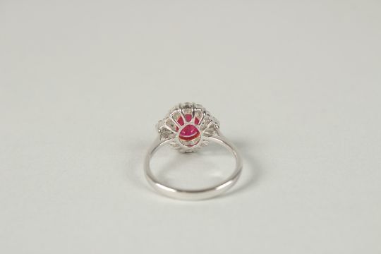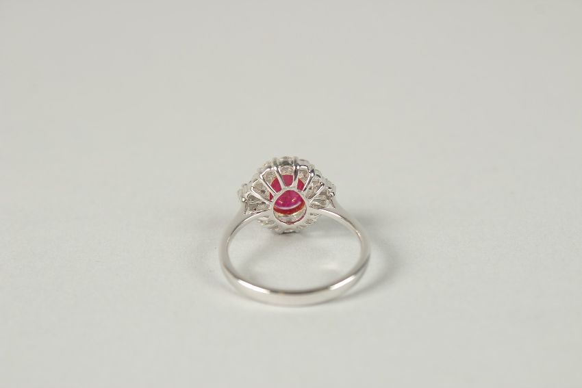 AN 18CT WHITE GOLD OVAL RUBY, RBC AND BAGUETTE DIAMOND CLUSTER RING.