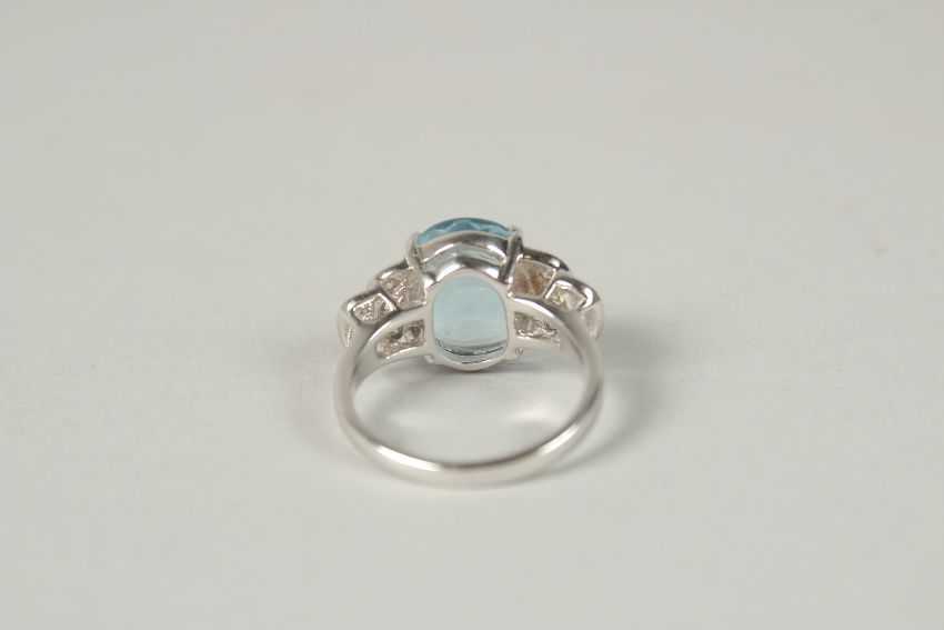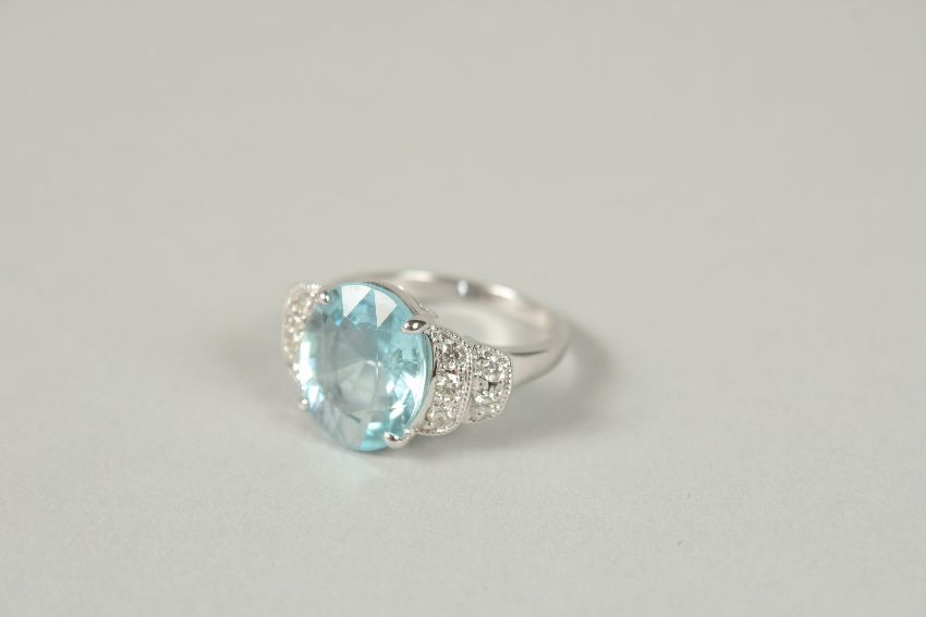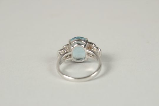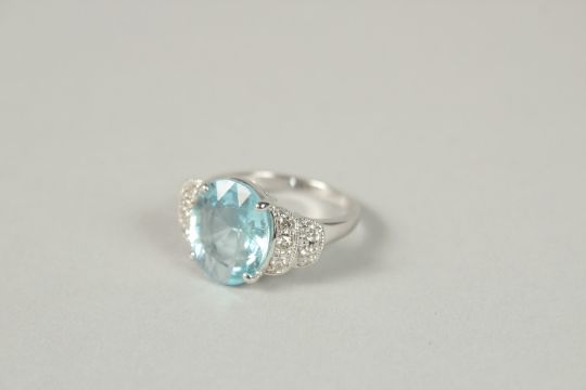 AN 18CT WHITE GOLD RING SET WITH AN OVAL AQUAMARINE FLANKED BY RBC DIAMONDS.