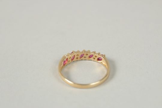 A 9CT YELLOW GOLD 9 STONE MARQUISE RUBY AND R/C DIAMOND RING, boxed.