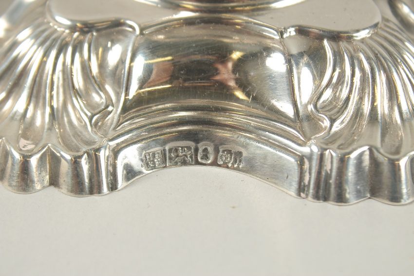 A PAIR OF GEORGE II CAST SILVER CANDLESTICKS.