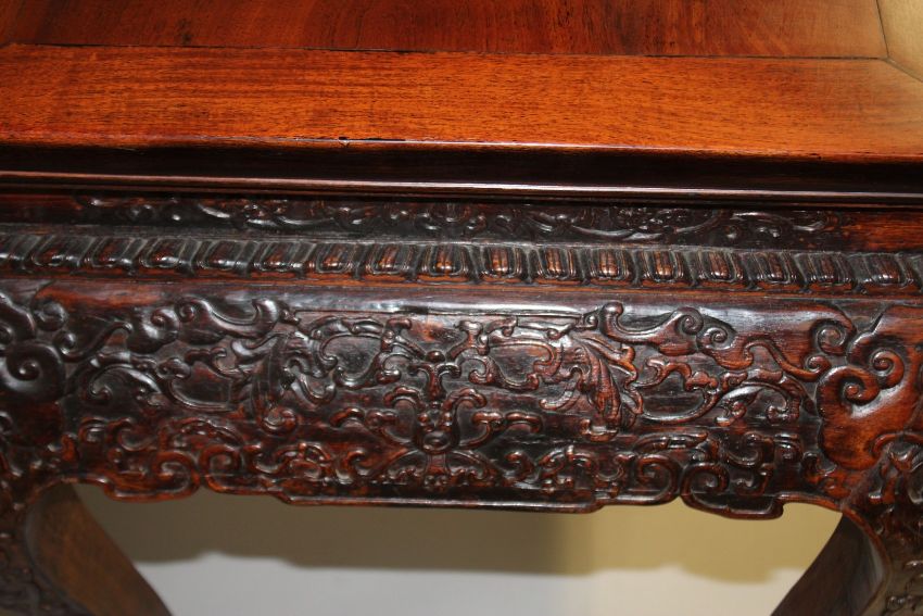 A VERY GOOD CHINESE ALTAR TABLE OR SIDE TABLE, 19TH CENTURY, POSSIBLY ZITAN OF HUANGHALI, with a plain rectangular top above a frieze carved with leaves and flowers, the corners carved with stylized birds heads, on curving legs with carved feet, overall size 170cm long, 70cm wide, 89cm high.