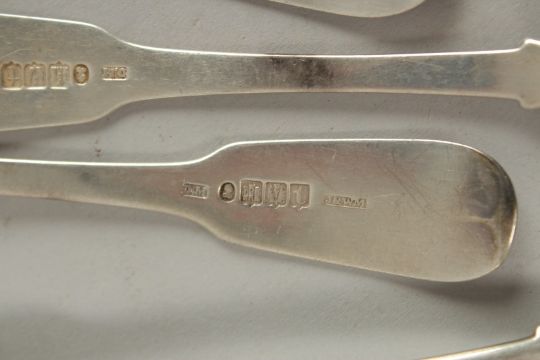 A SET OF TEN GEORGE IV FIDDLE AND SHELL PATTERN DESSERT SPOONS.