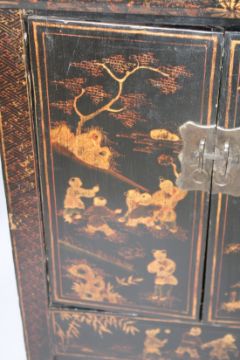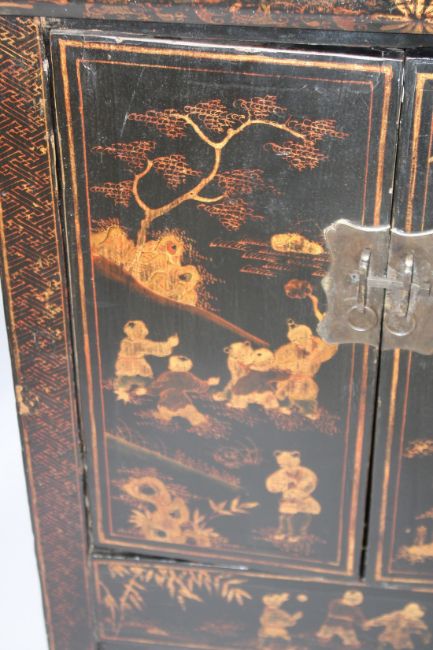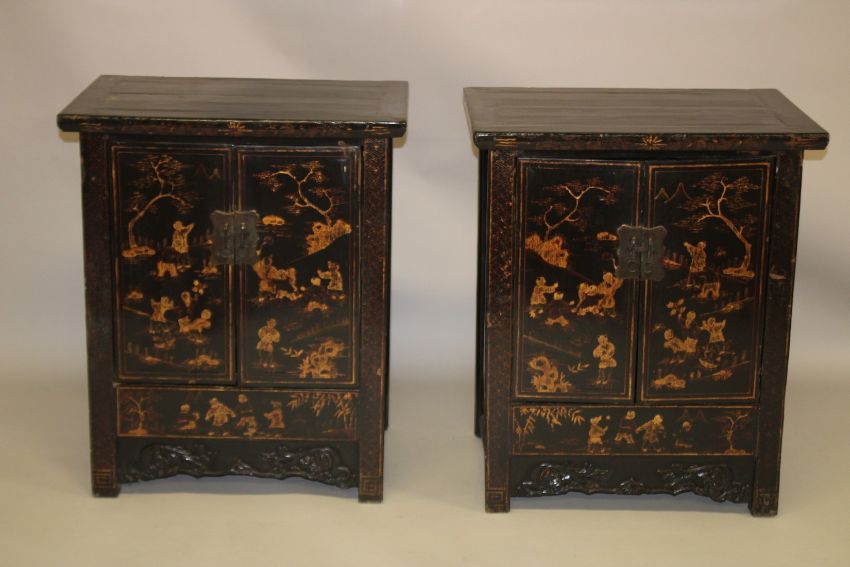 A PAIR OF CHINESE BLACK LACQUER AND CHINOSERIE DECORATED TWO-DOOR CABINETS, the pair of doors opening to reveal a shelf and storage compartments.