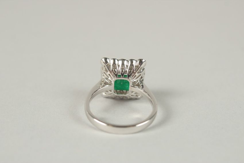 AN 18CT WHITE GOLD RING SET WITH AN OCTAGONAL STEP-CUT EMERALD, surrounded by RBC and baguette cut diamonds, boxed.