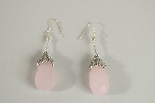 A PAIR OF SILVER AND ROSE QUARTZ EARRINGS.