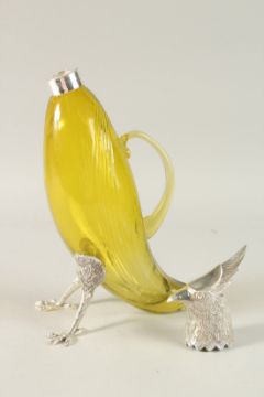 A LARGE AMBER GLASS AND SILVER PLATE BIRD CLARET JUG.