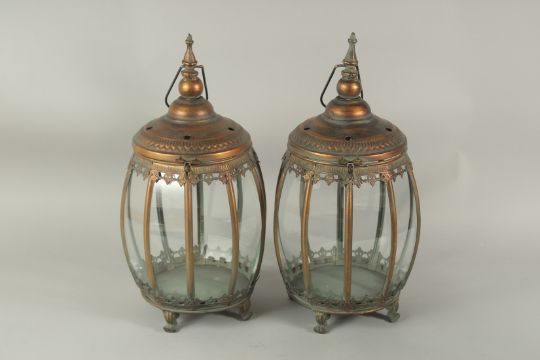 A PAIR OF METAL GLAZED CROWN TOP LANTERNS.