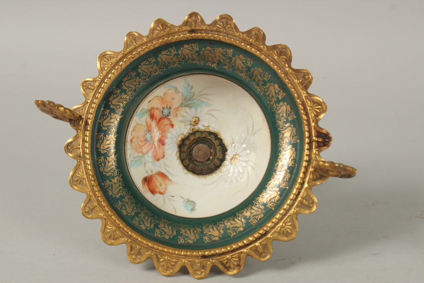 A CONTINENTAL PORCELAIN AND GILT METAL TWO HANDLED BOWL painted with flowers.