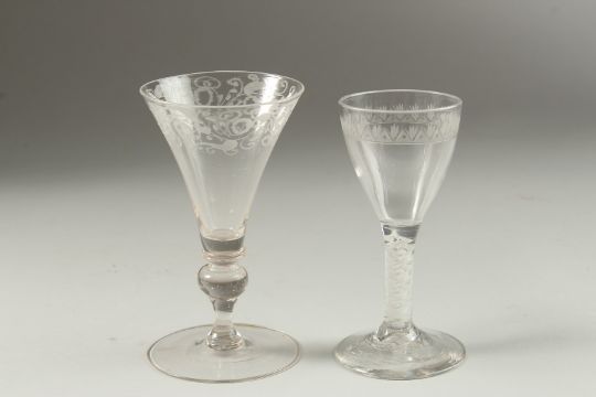 13cm high and AN ENGRAVED TRUMPET BOWL GLASS, 14cm high (2).