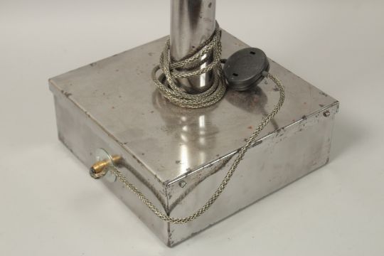 AN UNUSUAL FRENCH POLISHED STEEL CYCLING PROFICIENCY TRAFFIC LIGHT, with red, amber and green lights, on a column support, with platform base.