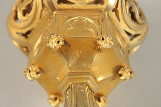 A CONTINENTAL SILVER GILT CHALICE AND COVER as a GOTHIC CHURCH with spire. In the MANNER OF PUGIN.