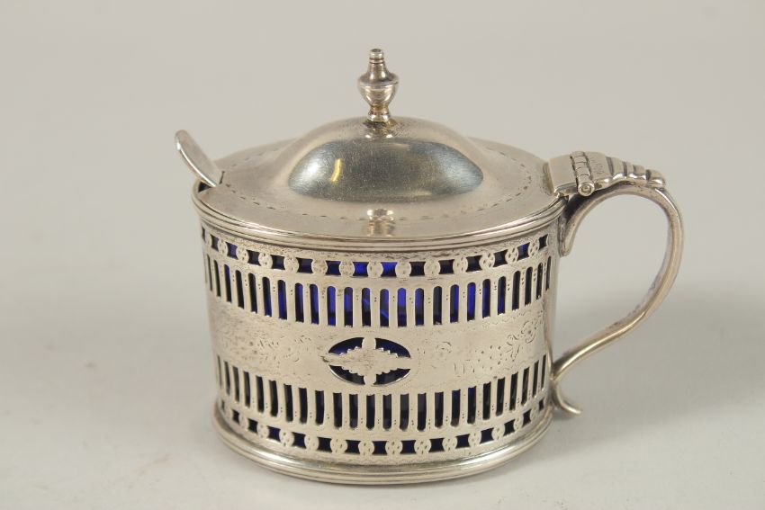 A GEORGE III SILVER OVAL MUSTARD POT with sapphire blue liner.