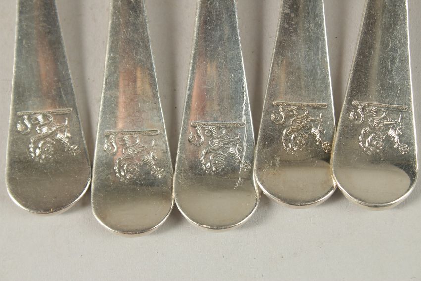 A SET OF ELEVEN GEORGE III SILVER OLD ENGLISH PATTERN TABLE FORKS with lion crest.